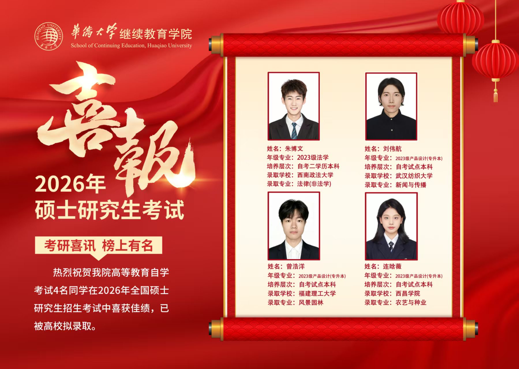 我院四名自考学子在2026年硕士研究生考试中喜获佳绩